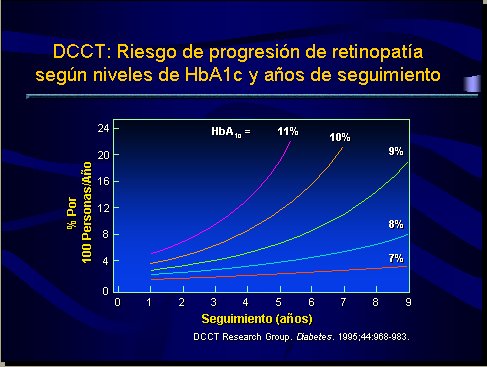 Tamaño completo Figura 1. DCCT: Riesgo de progresión de retinopatía según niveles de HbA1c y años de seguimiento.