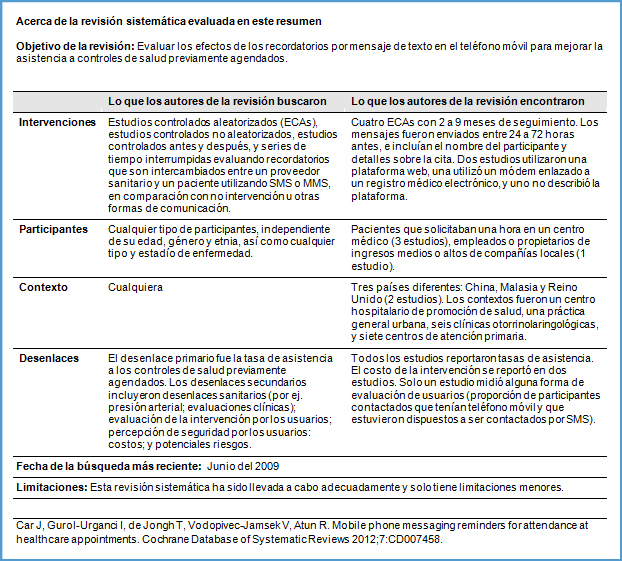 La no asistencia a las horas o controles previamente agendados tiene un impacto en la salud de los pacientes y costos para el sistema sanitario. Enviar recordatorios al teléfono móvil de los pacientes a través de mensajes de texto corto (Short Message Service- SMS) y Servicio de Mensajes Multimedia (Multimedia Message Service-MMS) puede aumentar la asistencia en comparación con no enviar ningún recordatorio, o con otro tipo de recordatorios, como aquellos por vía postal o a través de llamadas a teléfono fijo. Considerando la amplia penetración de los teléfonos celulares en varios países de bajos ingresos, esta alternativa es particularmente promisoria.