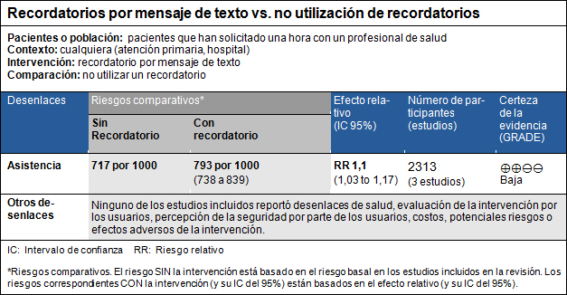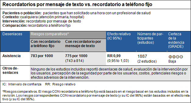 - No se encontraron estudios que evaluaran el impacto de los recordatorios por mensaje de texto en comparación con recordatorios a teléfono fijo, sobre desenlaces sanitarios, evaluación de la intervención por los usuarios, percepción de seguridad de los usuarios, costos, potenciales daños o eventos adversos de la intervención. La certeza de la evidencia es muy baja.