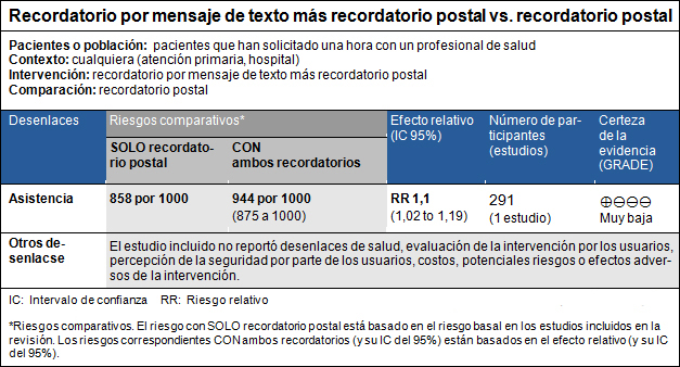 - No se encontraron estudios que evaluaran el impacto de los recordatorios por mensaje de texto agregados al recordatorio postal, en comparación con solo el recordatorio postal, sobre desenlaces sanitarios, evaluación de la intervención por los usuarios, percepción de seguridad de los usuarios, costos, potenciales daños o eventos adversos de la intervención. La certeza de la evidencia es muy baja.