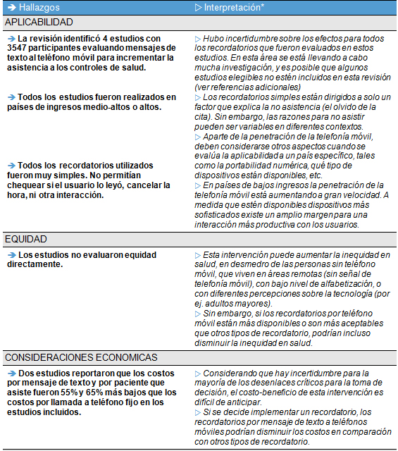 - No se encontraron estudios que evaluaran el impacto de los recordatorios por mensaje de texto en comparación con su no utilización, con llamadas a un teléfono fijo, o adicionado a un recordatorio postal, sobre desenlaces sanitarios,