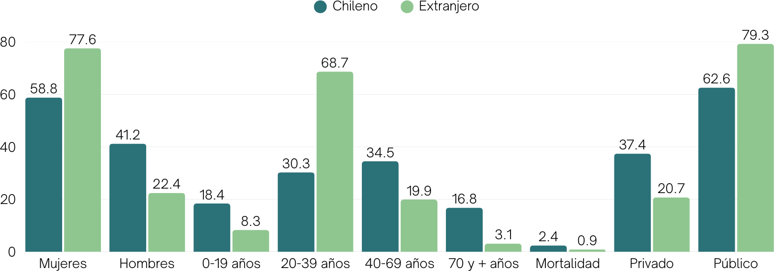 El principal prestador correspondió a hospitales públicos, que concentran el 79,3% de los egresos de extranjeros, cifra muy superior a los egresos de chilenos. El Fondo Nacional de Salud fue su principal asegurador (datos no mostrados).