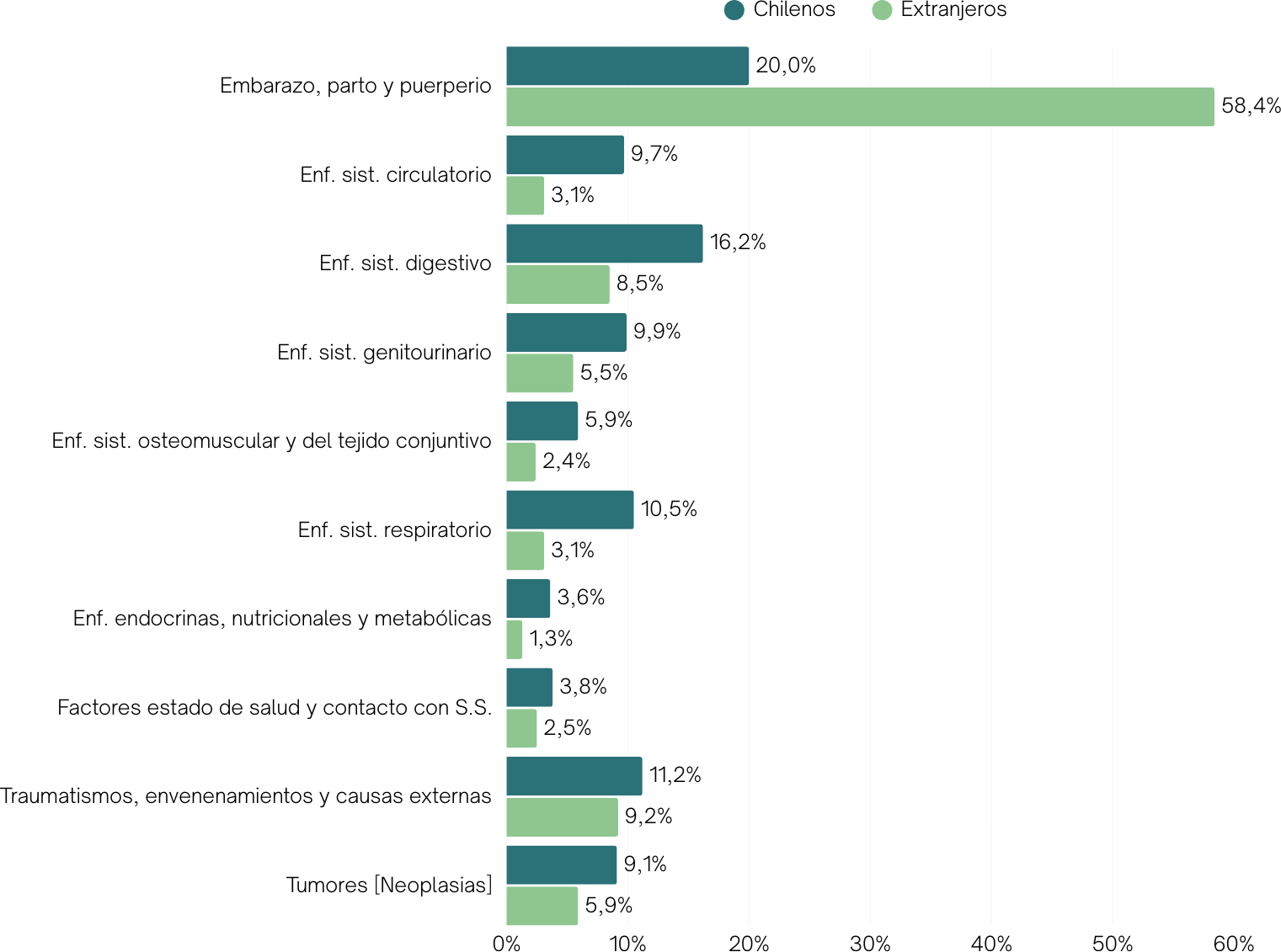 Resultados Se produjeron 16 013 995 egresos (95% chilenos, 2% extranjeros y 3% sin información). Los egresos de extranjeros presentan un alza mantenida, aumentado seis veces en la década (de 0,7% a casi 4%) y con mayores proporciones en el norte del país. Existen diferencias significativas en la distribución por sexo (chilenos: 41,2% hombres y 58,8% mujeres; extranjeros: 22,4% hombres y 77,6% mujeres). Según edad, en ambas poblaciones la mayor frecuencia de egresos ocurrió entre los 20 y 39 años (30,3% en chilenos y 68,7% en extranjeros). El resultado de fallecimiento al egreso ocurrió en 2,4% de chilenos y 0,9% de extranjeros. El diagnóstico de egreso más frecuente fue el grupo embarazo, parto y puerperio, con diferencias significativas (20% chilenos y 58,5% extranjeros). Los chilenos presentan mayor proporción de diagnósticos cardiovasculares (12,1% versus 7,5%) y de enfermedades respiratorias (13,2 versus 7,5%), mientras que en extranjeros hay mayor proporción del grupo de traumatismos, envenenamientos y otras causas externas (13,9% chilenos versus 22,1% extranjeros).