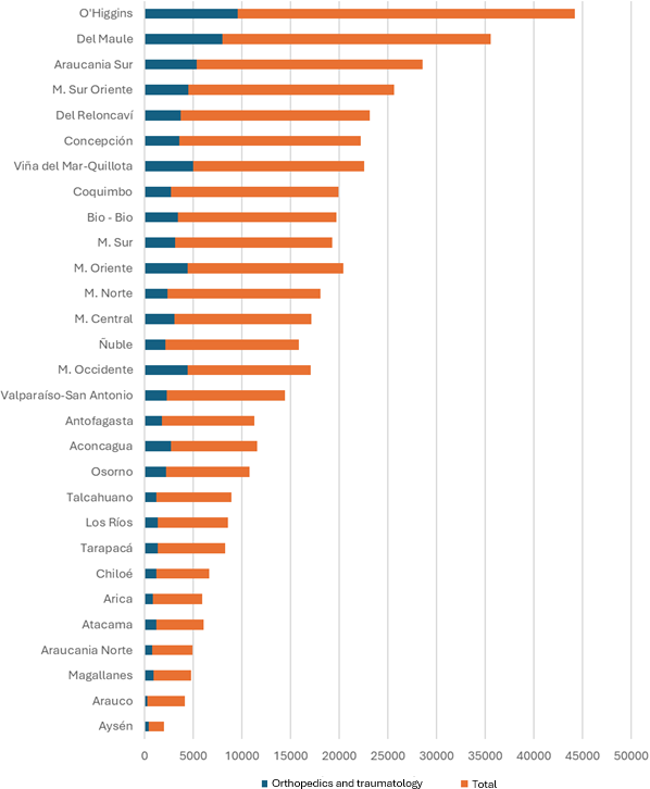 At the territorial level, the O'Higgins and Maule healthcare services had the highest volumes of pending trauma surgeries, both in absolute terms and adjusted by beneficiaries. Likewise, the ranking of specialties on hold showed significant differences between territories, although orthopedics and traumatology remained among the top positions in most of them.