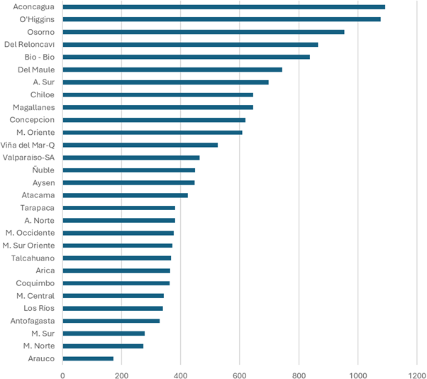 The study conducted by Cartes et al. [20] estimated that in 2023, the cost associated with the surgical waiting list would reach US$800 million. The analysis identified that the relative weight assigned to each Diagnosis-Related Group, the poverty index, age, specialty, and type of facility accounted for nearly 50% of these costs. Regarding geographical distribution, it was observed that the O'Higgins and Maule healthcare services accounted for the highest amounts. In addition, it was observed that the five services with the highest number of orthopedic and traumatology procedures awaiting treatment per 100 000 beneficiaries are concentrated in the Valparaíso and Los Lagos regions. This situation contrasts with the logic of greater backwardness in the extreme regions, where historically there are fewer specialists available. This suggests that territorial distribution does not always follow usual patterns, requiring a focused review.