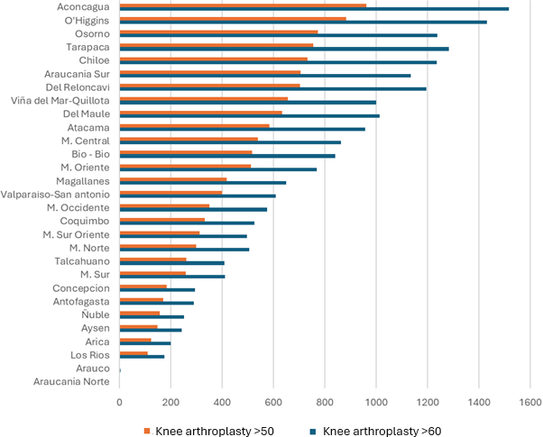 Results Orthopedics and traumatology were the specialties with the highest number of pending procedures (22 to 24% of the total). Knee arthroplasty consistently ranked first, with over 20 000 cases annually. The O'Higgins Health Service had the highest burden. In 2022, the rate of arthroplasties performed on patients covered by the National Health Fund was four times lower than on patients covered by Social Security Health Institutions. No region achieved a surgical volume sufficient to reduce the waiting list significantly.