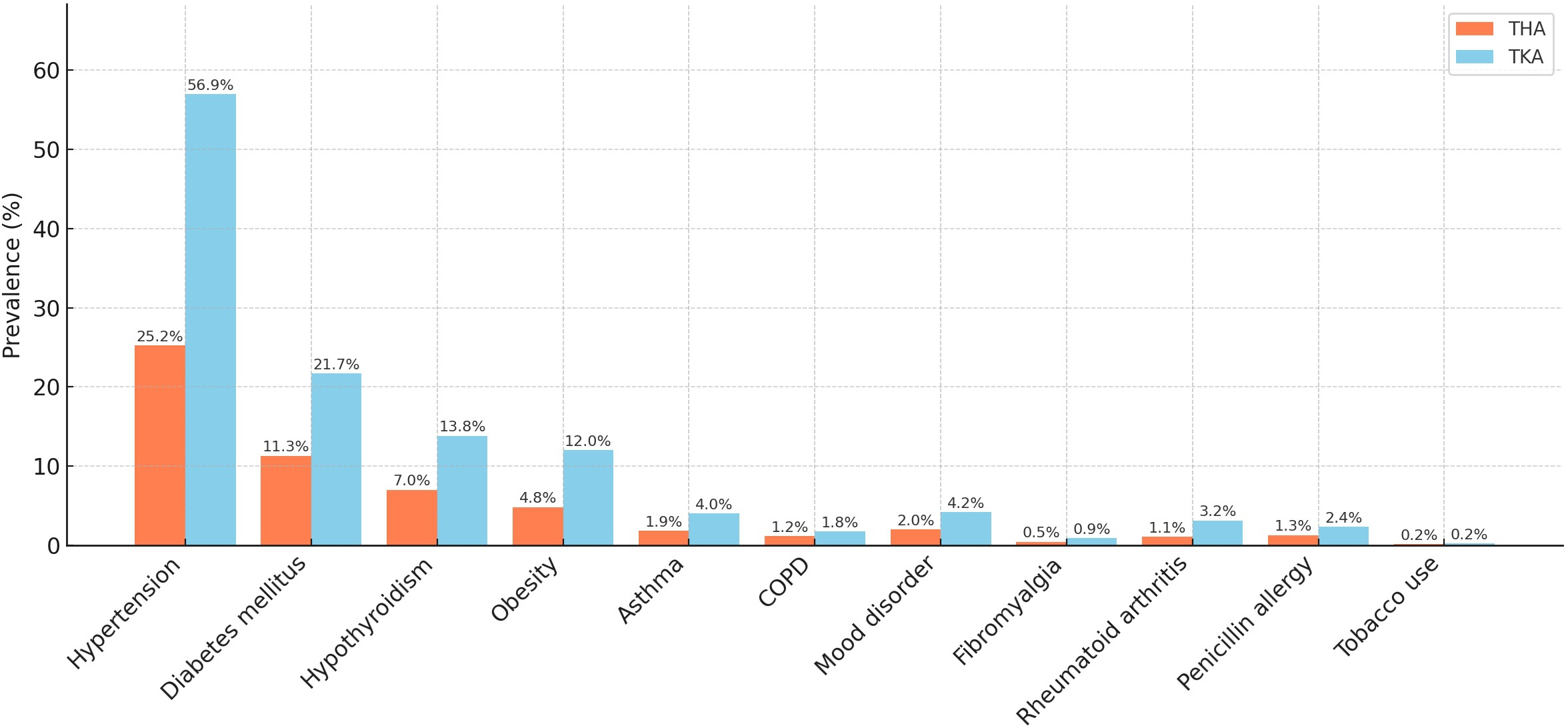 Percentage frequency of the most common comorbidities reported in primary hip and knee arthroplasty.