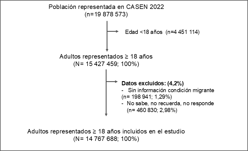 En Chile, un total de 15 427 459 personas desde los 18 años estuvieron representadas en la Encuesta de Caracterización Socioeconómica Nacional del año 2022. Posterior a los criterios de exclusión (4,3%), un total de 14 767 688 personas fueron consideradas para el análisis (Figura 1)
