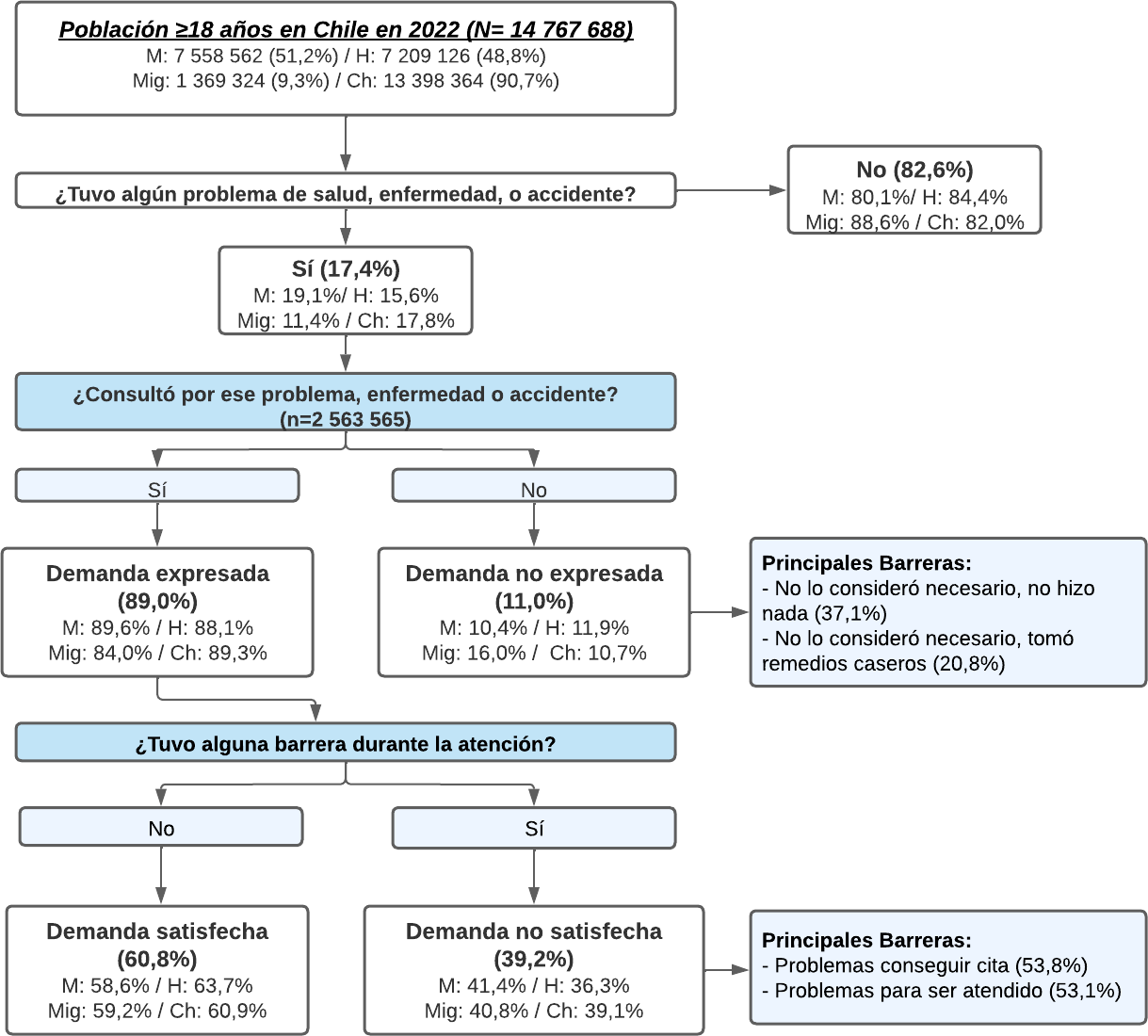 Introducción El año 2022, posterior a la pandemia de COVID-19, aproximadamente 93% de los países de la región de Las Américas continuaban reportando interrupciones en los servicios esenciales de salud, con peores desenlaces en grupos sociales vulnerables. El presente estudio tiene por objetivo describir las barreras en el acceso a la atención en salud en Chile, desglosado por sexo y condición migrante internacional.