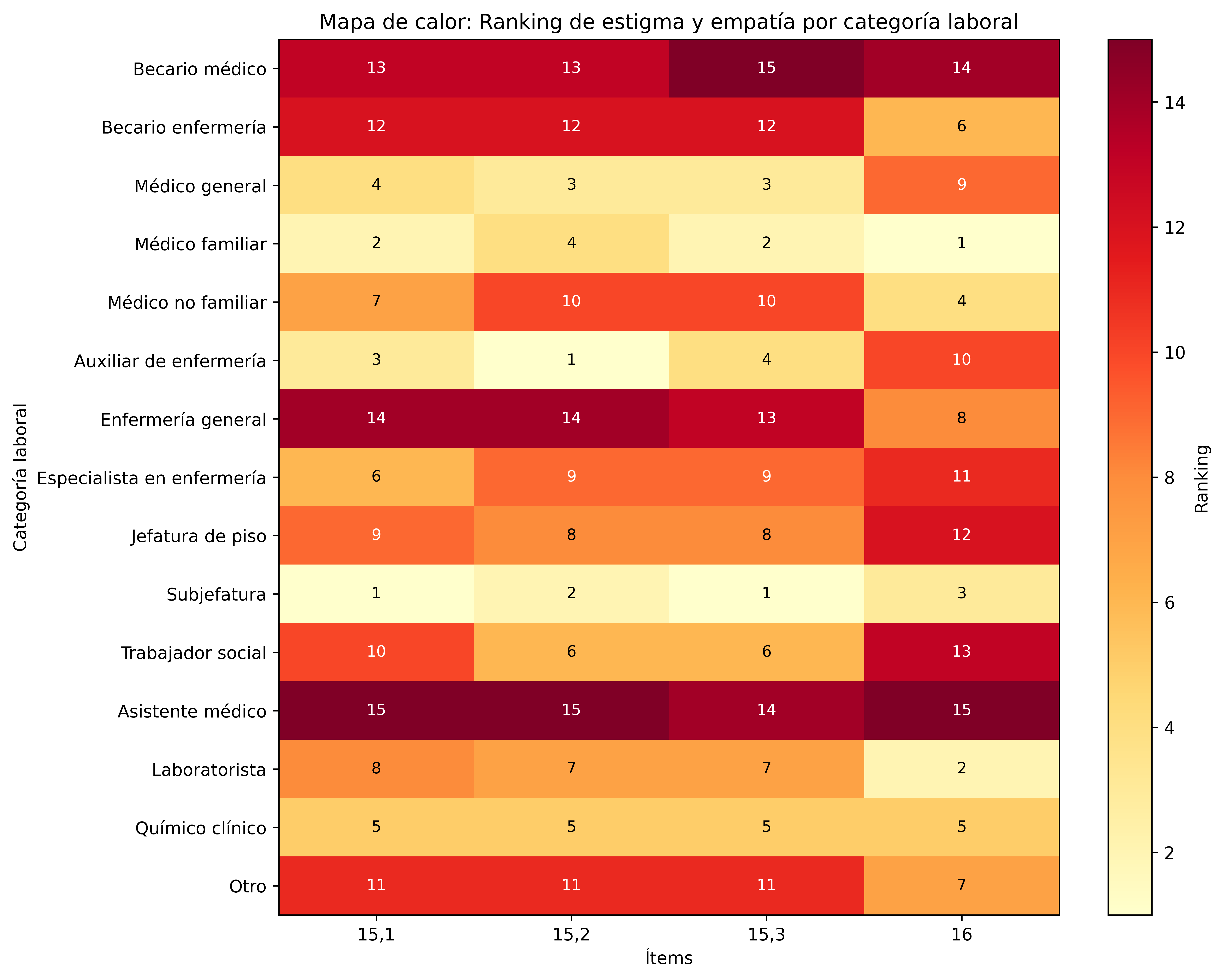 Adicionalmente, se elaboró un diagrama de calor como recurso descriptivo para visualizar el ranking relativo de estigma entre categorías laborales, entendido como la ordenación comparativa de las posiciones del 1 al 15 según el grado de acuerdo con las afirmaciones estigmatizantes evaluadas.