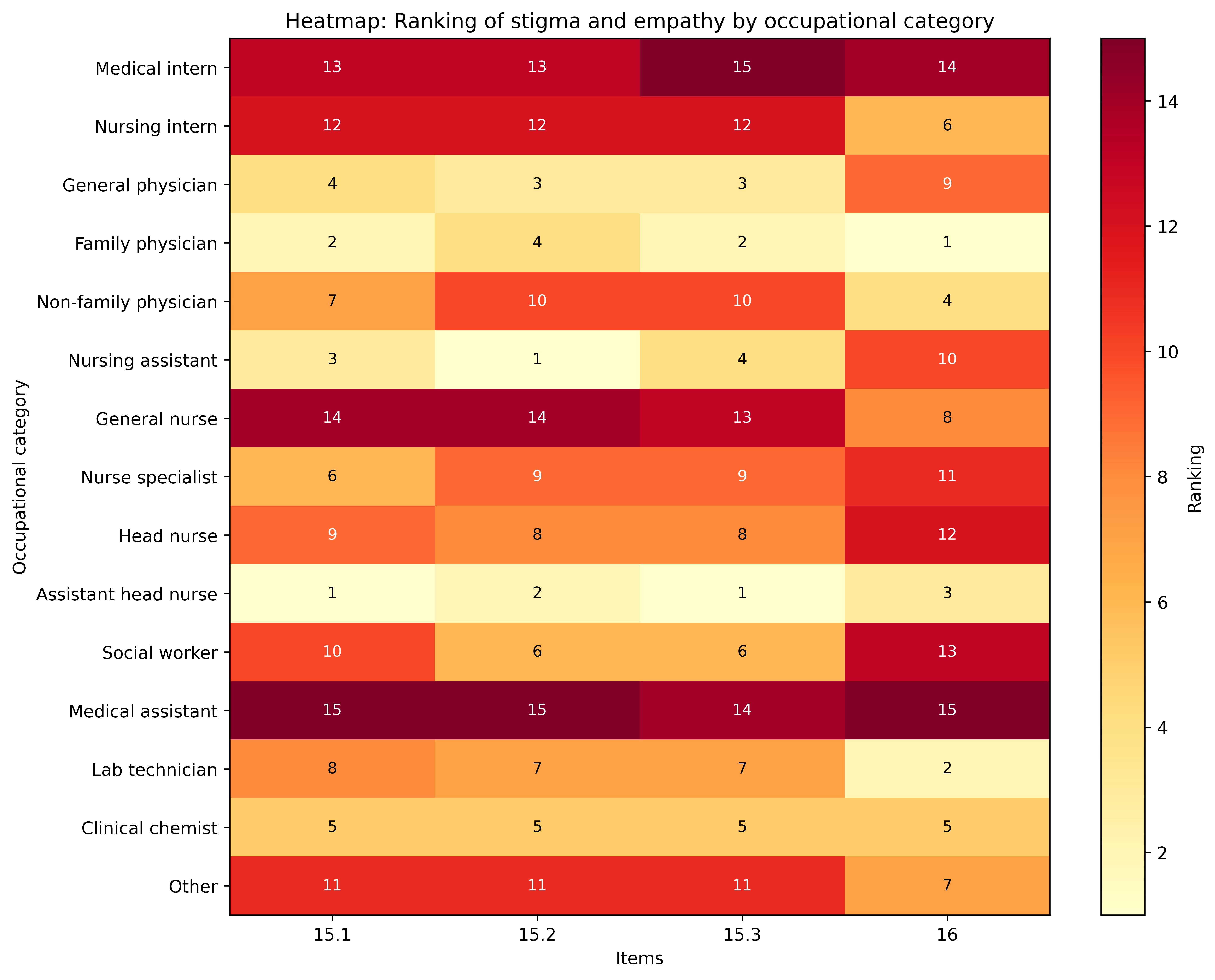 In addition, a heat map was created as a descriptive tool to visualize the relative ranking of stigma across occupational categories, defined as the comparative ordering of positions 1 through 15 based on the degree of agreement with the evaluated stigmatizing statements.