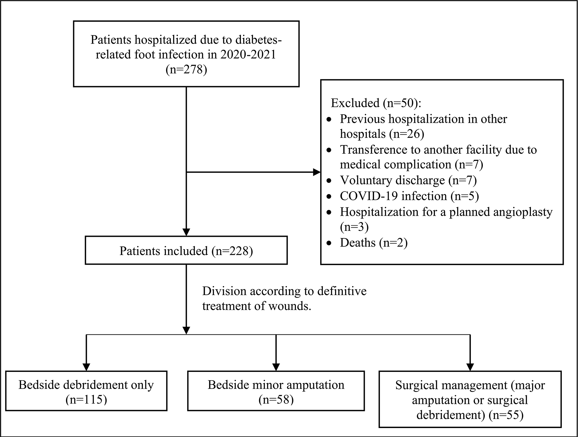 Between January 2020 and December 2021, a total of 278 patients were hospitalized with diabetes-related foot infections. Fifty patients were excluded (Figure 1), including two who died from sudden cardiac arrest during hospitalization; both had end-stage renal disease. Thus, data from 228 patients were included in the final analysis.