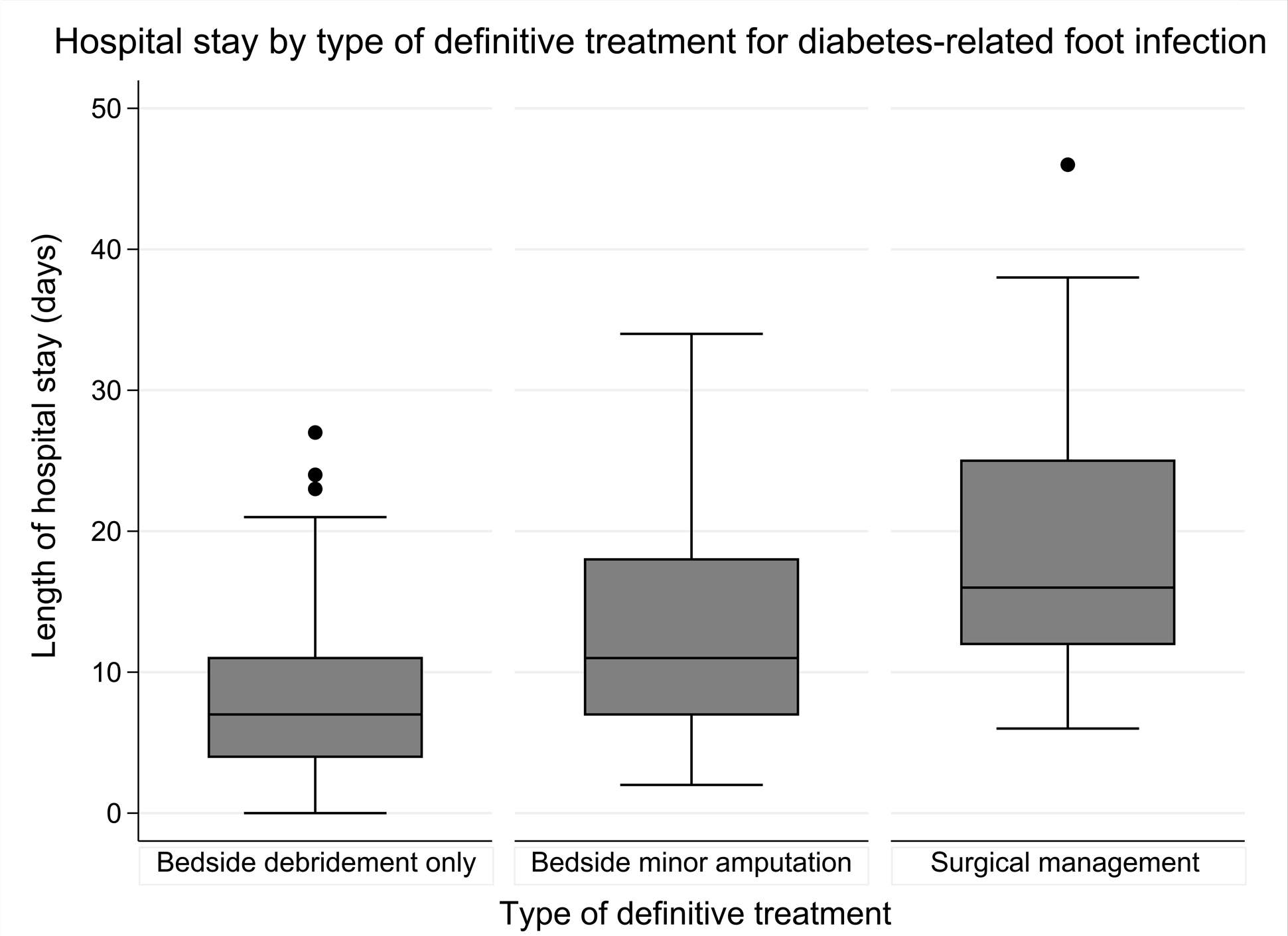 Box and whisker plot of hospital stay by type of definitive treatment of diabetes-related foot infection.
