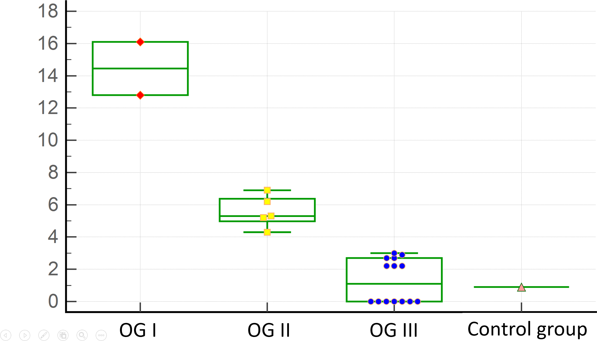 By grouping cancer types according to the frequency of mesenteric panniculitis, three subgroups were arbitrarily formed: oncological group I with a high frequency of mesenteric panniculitis (equal to or greater than 10%), oncological group II with an intermediate frequency (equal to or greater than 4% but less than 10%), and oncological group III with low frequency (less than 4%), as shown in Table 1 and Figure 2.