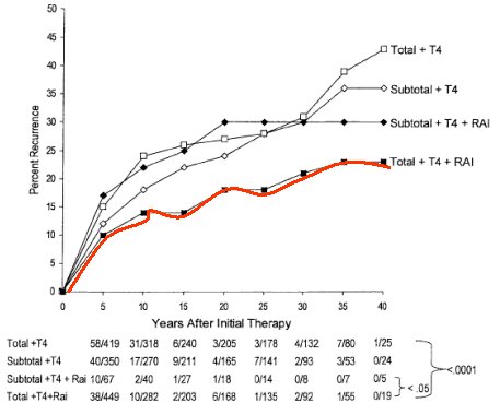 En el clásico trabajo de Mazzaferri (Current approaches to primary therapy for papillary and follicular thyroid cancer), que hizo un seguimiento a largo plazo, se demostró que el principal problema es que la tasa de recurrencia puede variar según el enfoque inicial, como puede verse en la Figura 1.