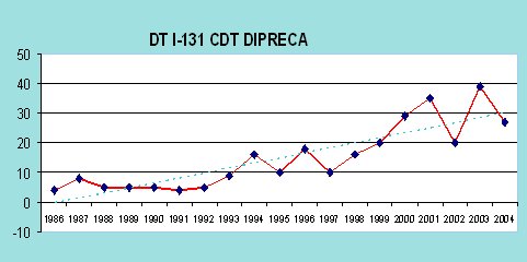 Tamaño completo Figura 2. Terapia de Radioyodo en cáncer diferenciado de tiroides. Casos anuales, Hospital DIPRECA, período 1986- 2004. DT I31: Número de dosis anuales.