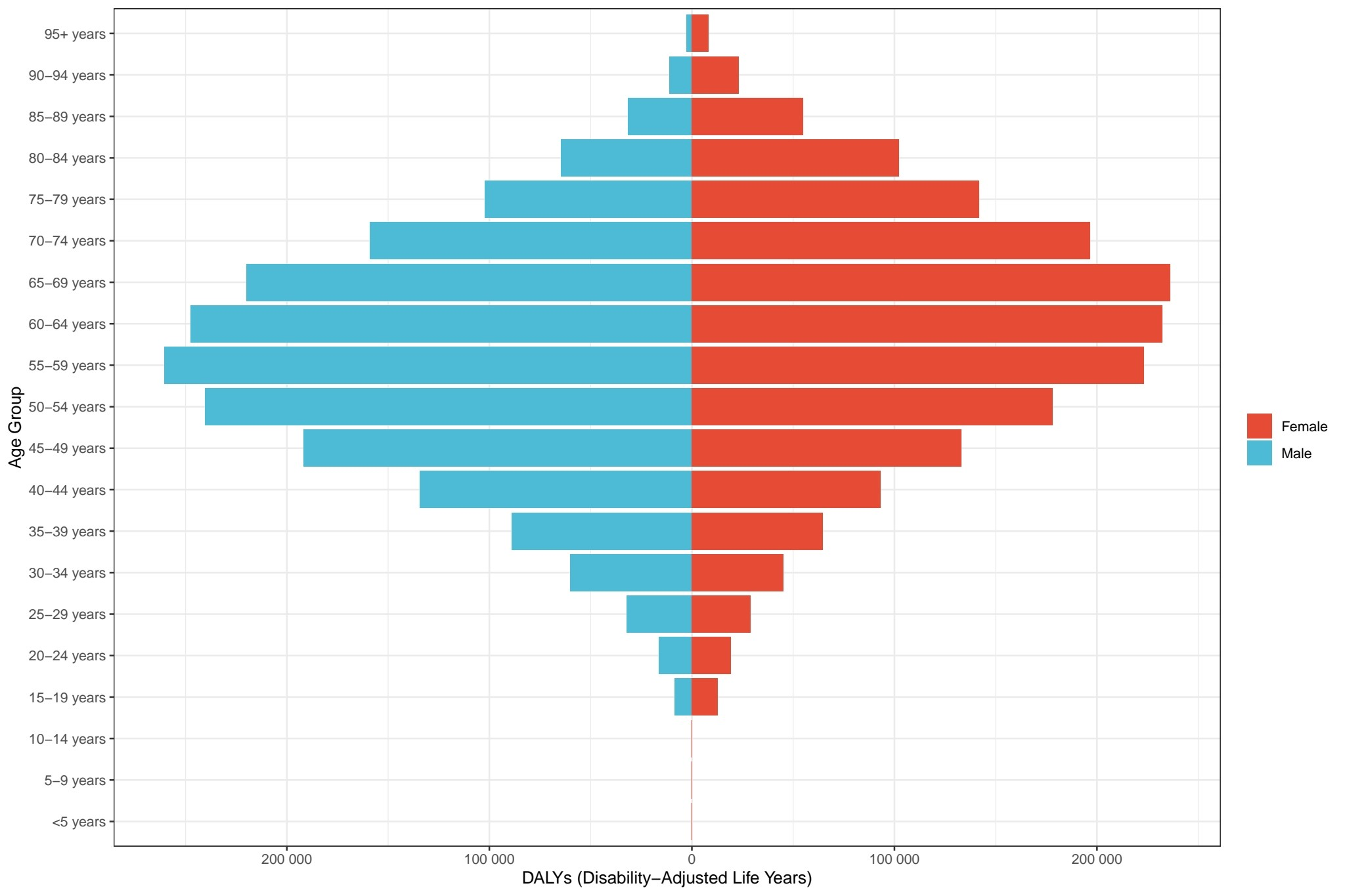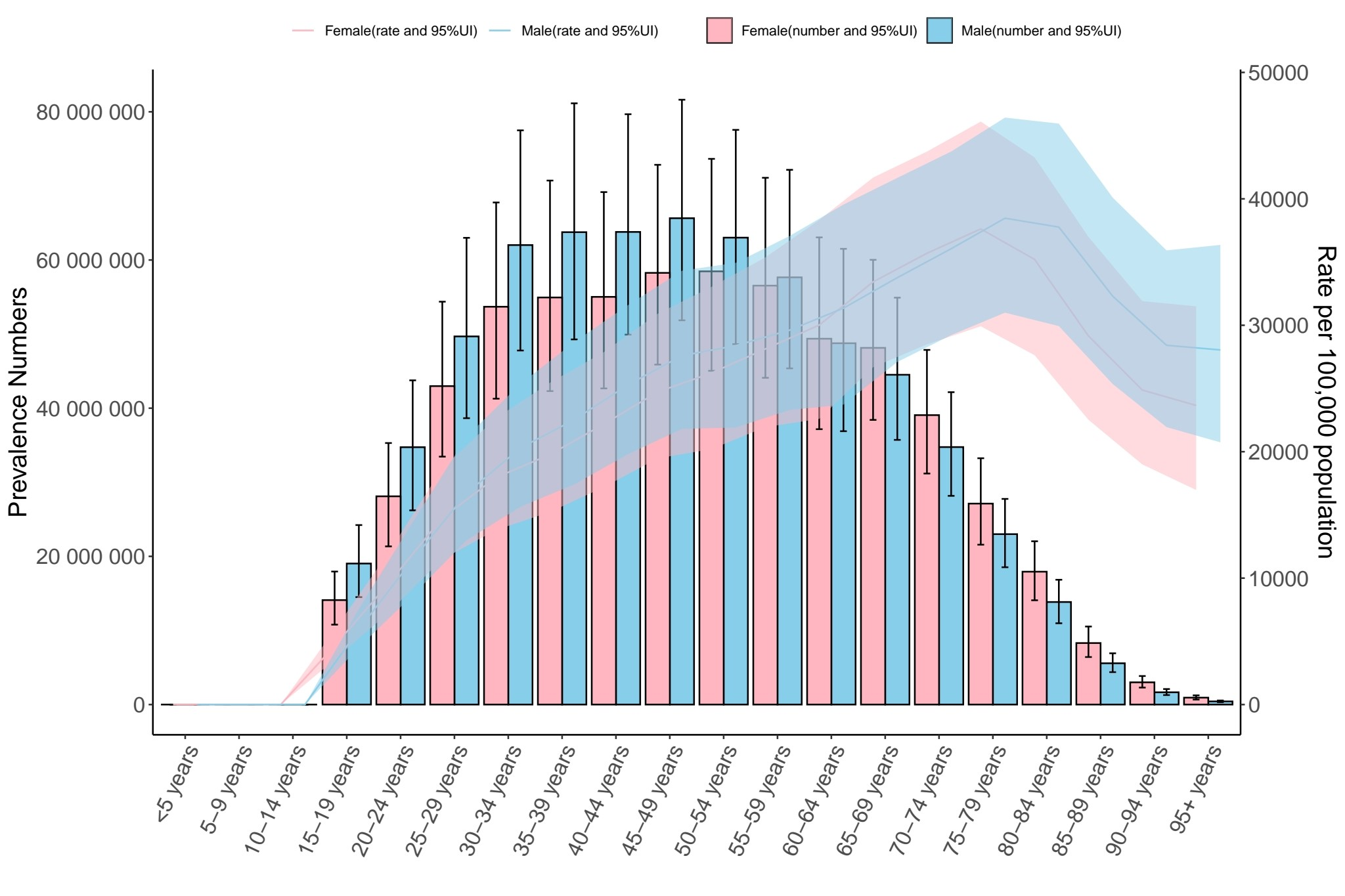 Statistical analysis was performed using R software (version 4.2.2). Incidence, prevalence, and disability-adjusted life years (per 100 000 population) and their 95% confidence intervals (CIs) were calculated. Visualizations were created with the "ggplot2" package.