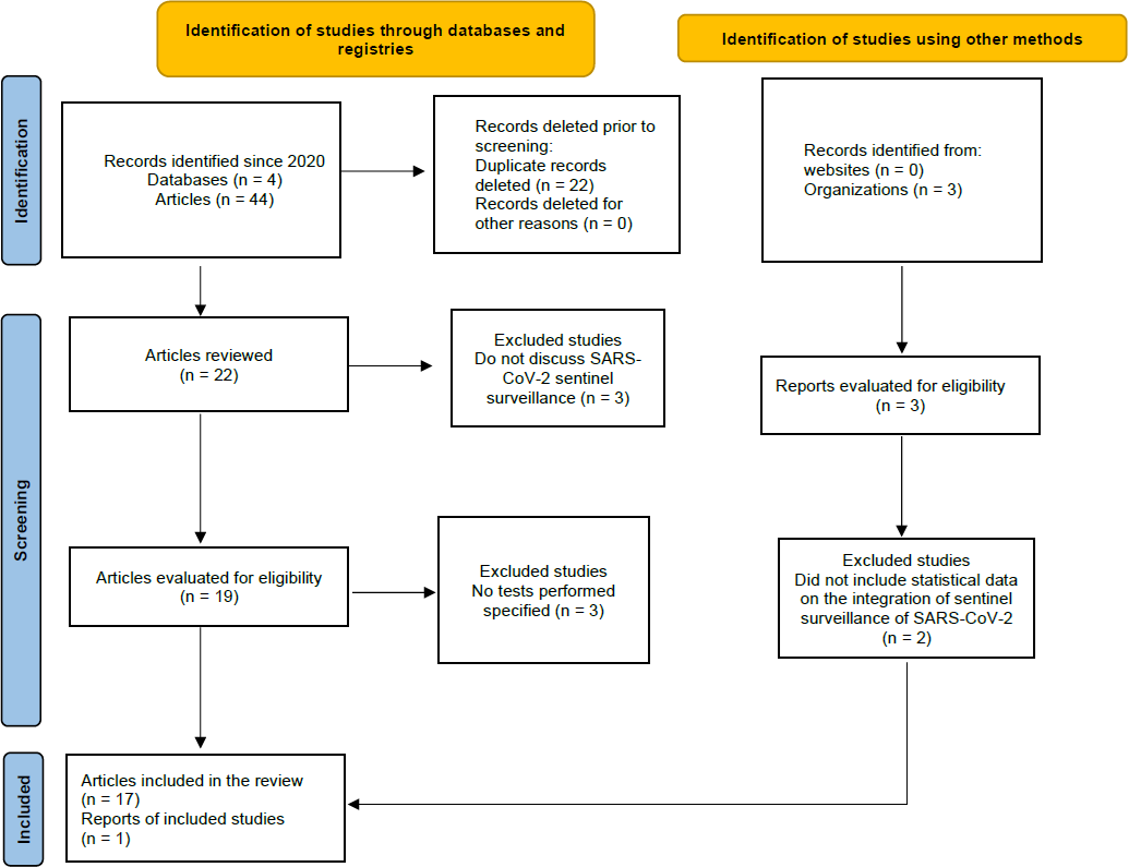 After selecting the studies, a literature review of the references from the selected articles was conducted. The systematic search was limited to publications in English and Spanish, and focused on studies published since 2019. In addition, a search of gray literature was included in technical and operational reports issued by public health agencies, such as the WHO, and by governmental entities. Incomplete studies, opinion articles, narrative reviews, articles that did not include the impact of COVID-19 integration into sentinel surveillance systems, and studies conducted outside the temporal context of the SARS-CoV-2 pandemic were excluded.
