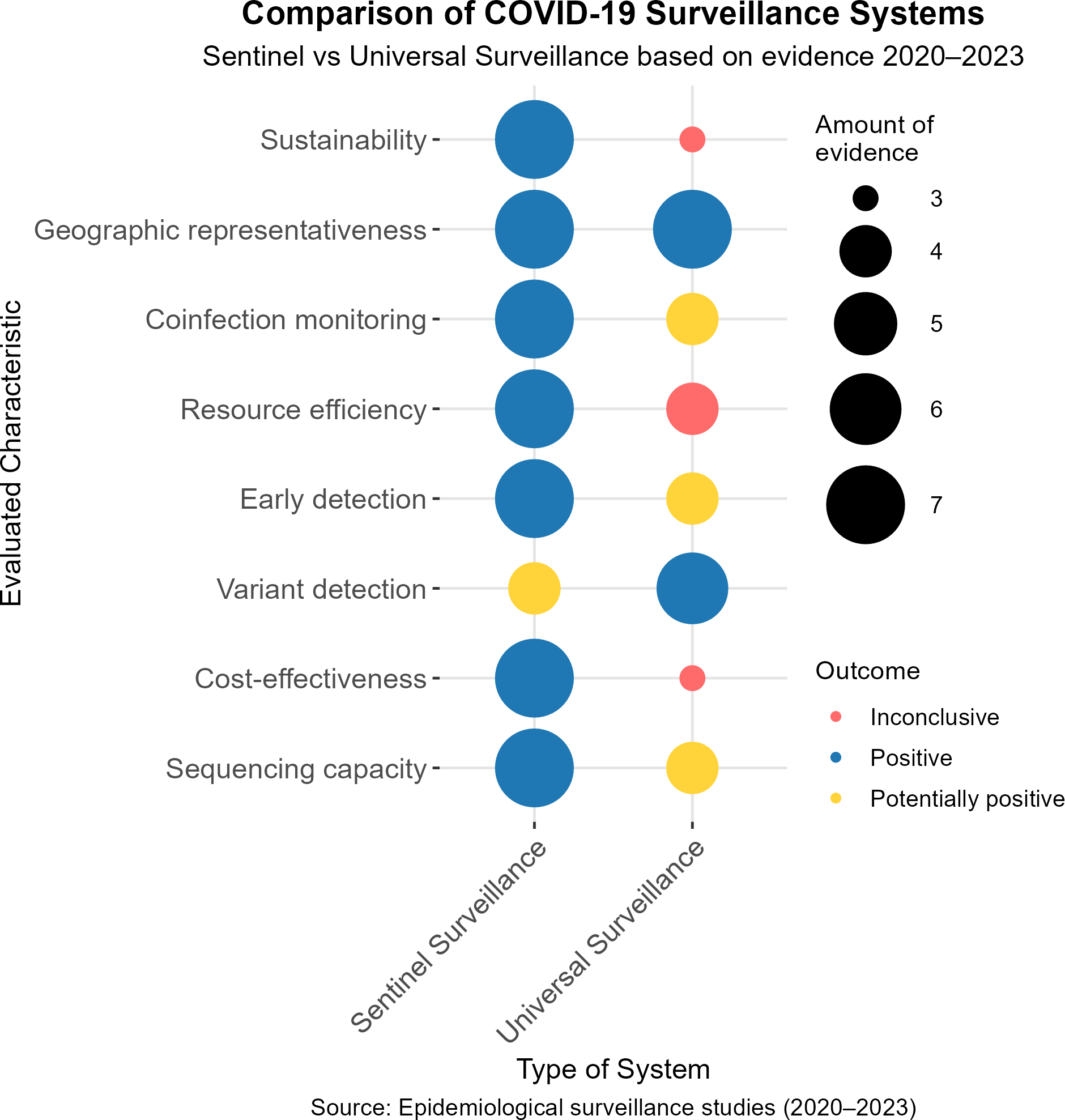 Epidemiological surveillance of COVID-19 has represented a global challenge for health systems, requiring adaptive and efficient approaches to its monitoring. Among the systems implemented, sentinel surveillance and universal surveillance have been widely discussed in terms of their performance, sustainability and capacity to generate relevant information in diverse contexts. Based on the evidence available between 2020 and 2023, eight key characteristics have been evaluated: sustainability, geographic representativeness, coinfection monitoring, resource efficiency, early detection, variant detection, cost-effectiveness and sequencing capacity. The results are classified as positive, potentially positive, and inconclusive, with the amount of evidence supporting each finding also indicated (Figure 2).