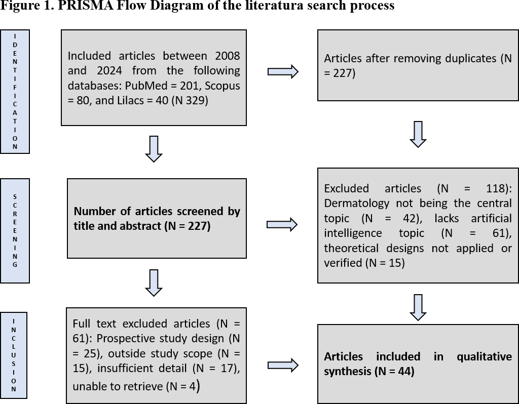 Of 329 articles that were found in databases, 102 duplicates were discarded. By title and abstract, 118 were discarded because dermatology was not the central topic, did not include the topic Artificial Intelligence, or featured theoretical designs without application or evidence. The remaining 109 were downloaded and stored in PDF format for complete review by the research group. Subsequently, 64 articles were discarded for not meeting the inclusion criteria after review, leaving a total of 44 articles, as shown in Figure 1. This figure summarizes the identification process, including the understanding of eligibility criteria based on originality, methodology, and relevance, as well as the inclusion of articles.